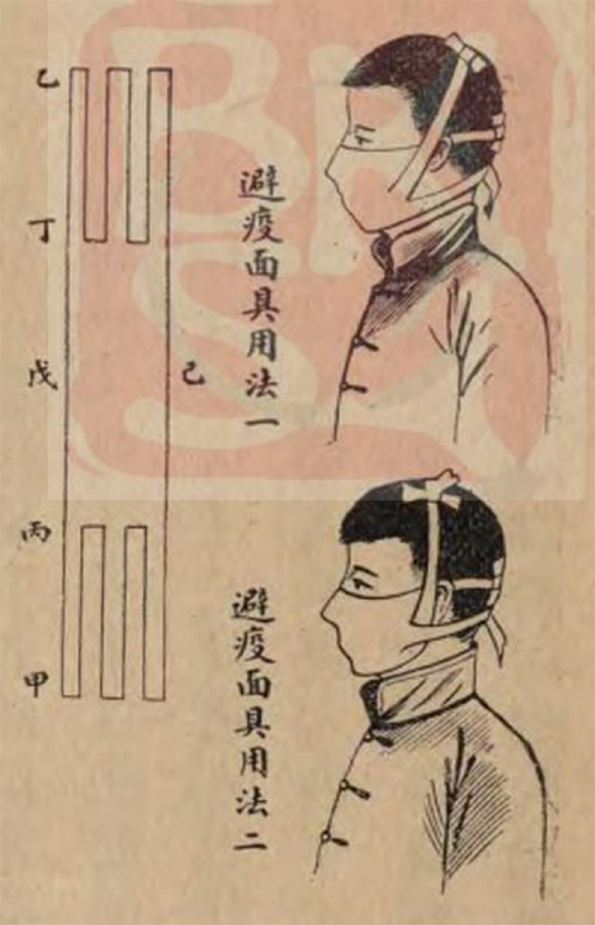 Diagram and instructions on how to wear an anti-plague mask in two ways. 避疫而具用法一/二 translates to “Method 1/2 for using masks to prevent the epidemic. Source: Yu Fengbin 俞鳳賓. Zhonghua yixue zazhi 中華醫學雜誌 [China medical journal] 4, no. 2 (1918): 76–79.